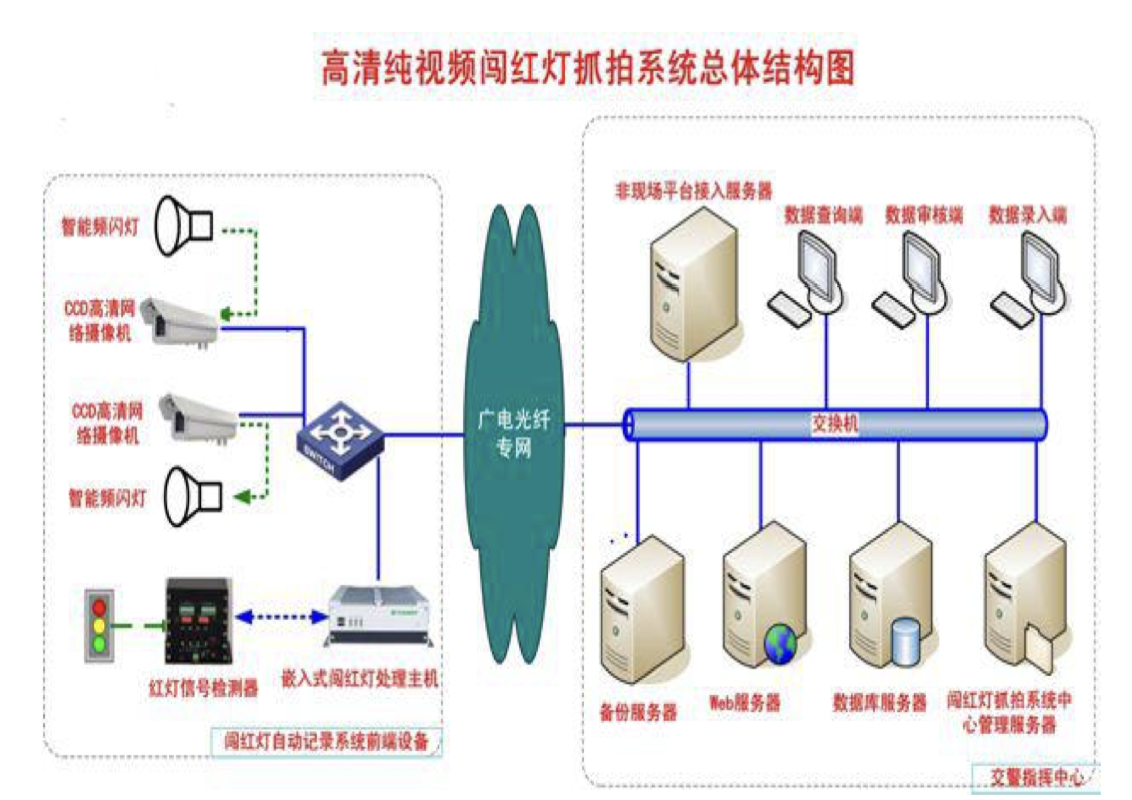 高清電子警察系統(tǒng)由前端自動(dòng)取證系統(tǒng)、傳輸系統(tǒng)、后臺(tái)管理系統(tǒng)三部分組成。前端自動(dòng)取證系統(tǒng)主要由高清 CCD 全景(兼特寫)攝像機(jī)、紅燈信號(hào)檢測(cè)設(shè)備、防護(hù)機(jī)箱等組成;傳輸系統(tǒng)主要是通訊設(shè)備(光纖收發(fā)器、光纖、E1 專網(wǎng)等);后臺(tái)管理系統(tǒng)主要由后臺(tái)管理軟件、計(jì)算機(jī)查詢管理端、應(yīng)用服務(wù)器、存儲(chǔ)設(shè)備、顯示設(shè)備及打印機(jī)等組成。結(jié)構(gòu)圖如下圖所示: