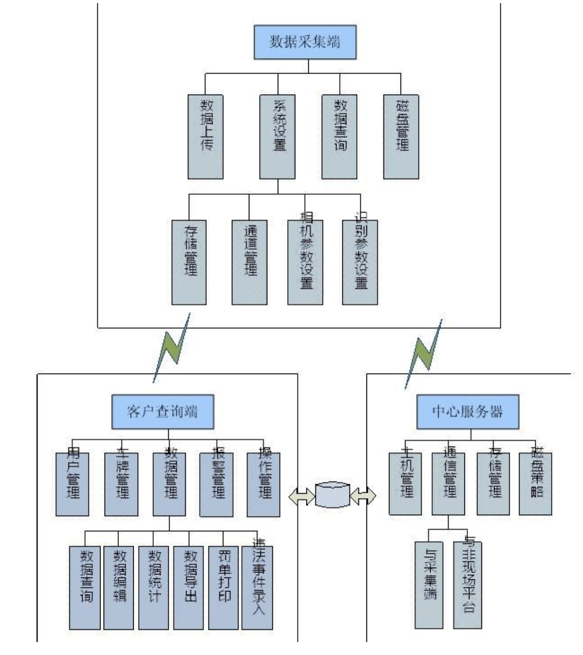 本系統(tǒng)主要分為純視頻高清電子警察數(shù)據(jù)采集端、中心服務(wù)器、客戶查詢端三個(gè)子系統(tǒng),子系統(tǒng)通過(guò)局域網(wǎng)相連,中心服務(wù)器將數(shù)據(jù)上傳到公安內(nèi)網(wǎng)的非現(xiàn)場(chǎng)執(zhí)法平臺(tái)。框架圖如下圖所示