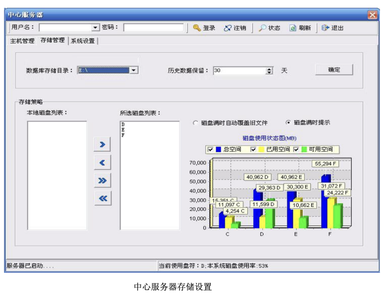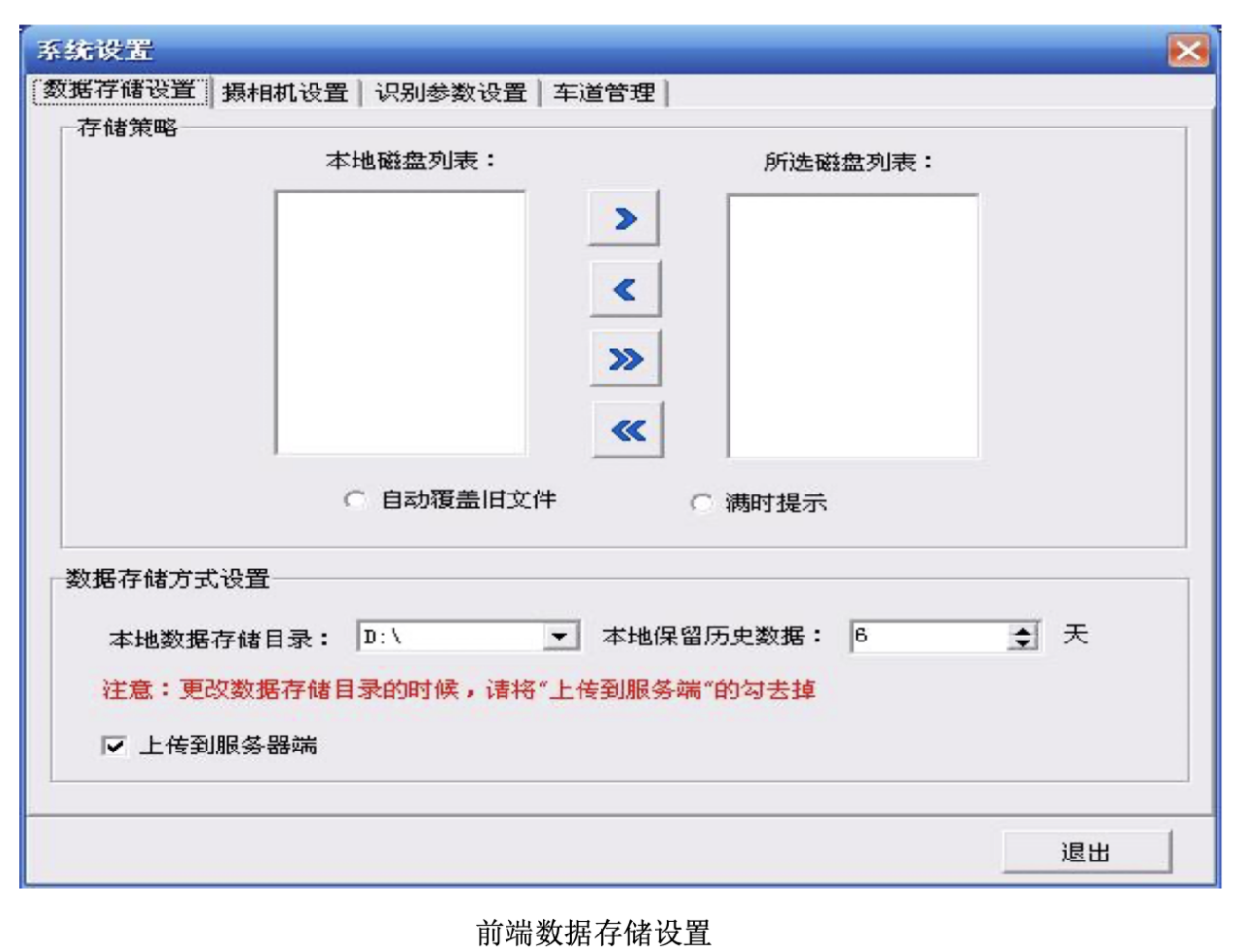a)存儲(chǔ)設(shè)置。設(shè)置本地存儲(chǔ),包括:當(dāng)前存儲(chǔ)目錄、本地可用磁盤、存儲(chǔ)天數(shù)、磁盤策略等??梢赃x擇將數(shù)據(jù)上傳到中心服務(wù)器。
