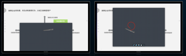 系統(tǒng)還具備單獨的小黑板功能,在任意界面可以通過手或者筆從底部向上拉呼出小黑板,便于在會議中部分擴展內(nèi)容的單獨講解。