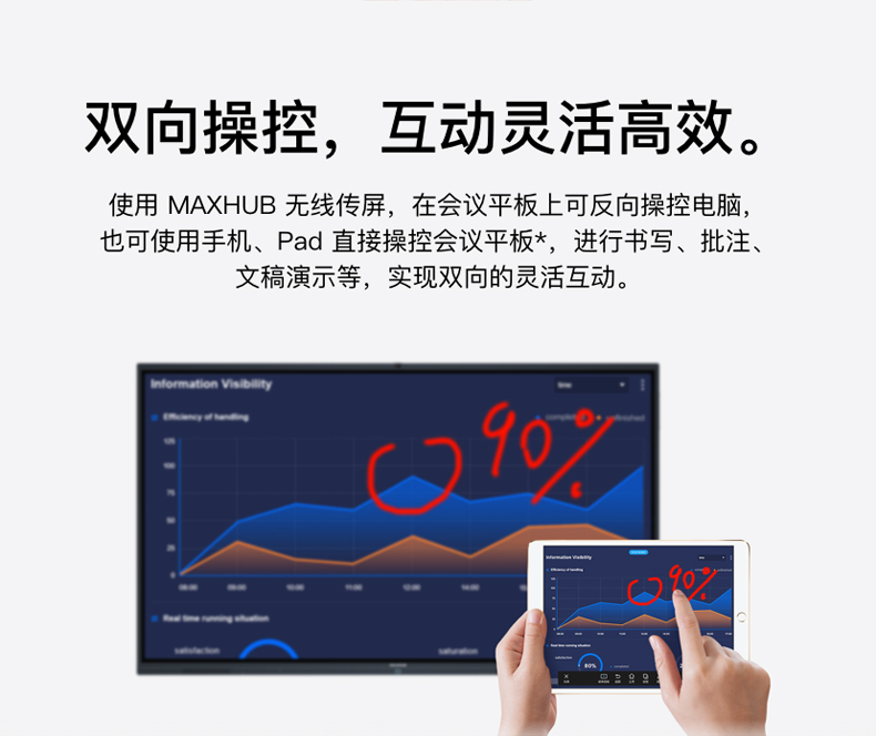 為您帶來了全新的交互和展示方式,電腦、手機、手持平板可輕松將畫面內(nèi)容無線傳屏至會議平板上。您只需站在大屏前就能觸控翻頁,還可以隨時對重點內(nèi)容進行批注,幫助展示變得輕松流暢。
