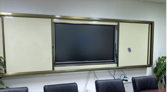 正面顯示為一個(gè)由三塊拼接而成的平面普通黑板,可以在上面用各種水筆書寫,又可以根據(jù)需要采用粉筆書寫。當(dāng)打開電源時(shí),中間一塊顯示出液晶的顯示畫面,可以進(jìn)行觸摸互動(dòng),而關(guān)掉時(shí),顯示畫面隱形,又顯示為一個(gè)普通黑板的表象,在上面進(jìn)行書寫。