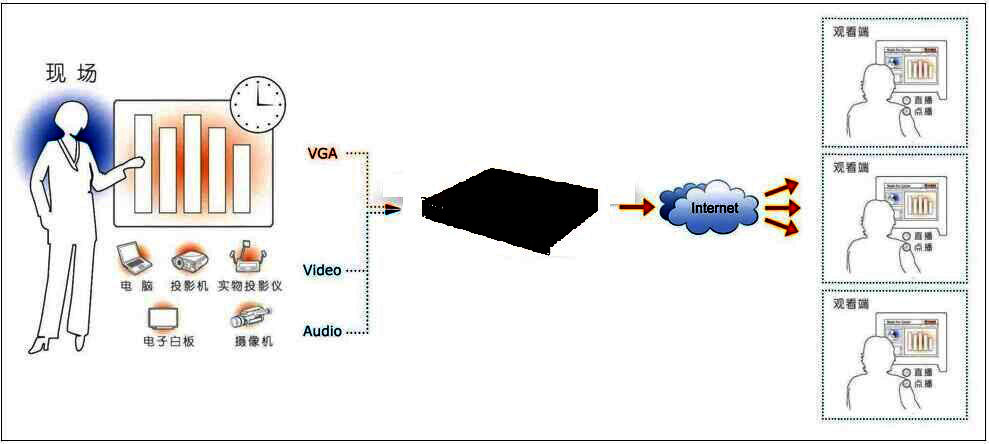 2、 可以把教室的實(shí)況通過網(wǎng)絡(luò)直播到校內(nèi)各個(gè)多媒體教室,異地用戶也可以用電腦通過網(wǎng)絡(luò)進(jìn)行同步收看。