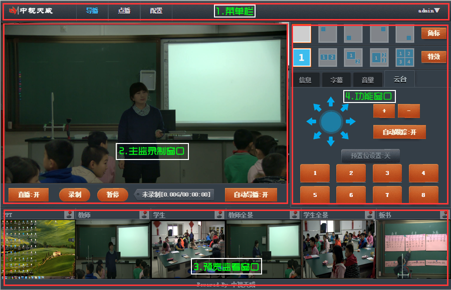 具備手動(dòng)導(dǎo)播和自動(dòng)導(dǎo)播兩種方式。同時(shí)可以實(shí)現(xiàn)遠(yuǎn)程在線web導(dǎo)播,支持導(dǎo)播臺(tái)控制與網(wǎng)頁控制兩種應(yīng)用方式,操作人員可手動(dòng)導(dǎo)播教師信號(hào)、學(xué)生信號(hào)、板書信號(hào)、教師機(jī)電腦VGA信號(hào)。
